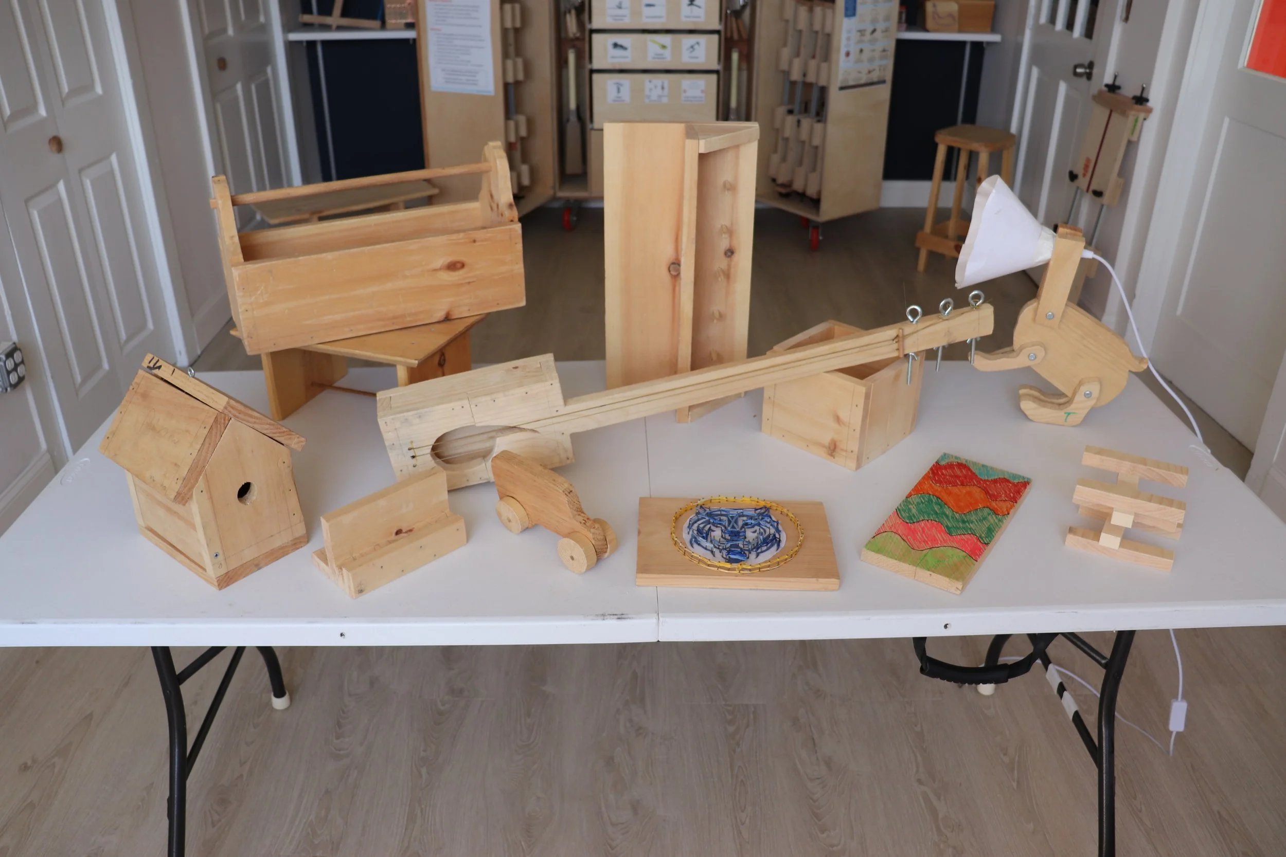 The bookcase with dowels teaches precision measurement and advanced joinery. The bookcase with dowels is 3'x3' with three shelves and takes roughly 420 minutes based on age and skill level of students.