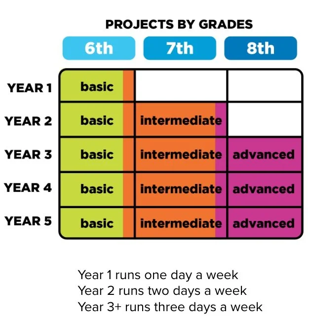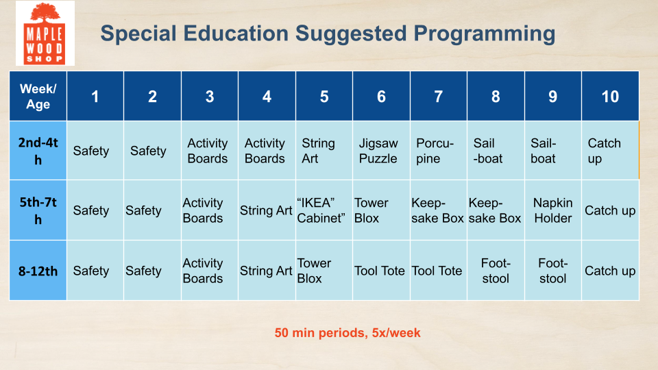 Fr Middle and High school, you can program Maplewoodshop to scaffold skills from 6th to 8th grade or from 9th-12th grade meeting over a semester